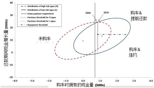 下图显示了一个二维变量,客户购车时拥有的现金量和还款期间现金增量的关系分析。两个椭圆是高、低风险客户的在两个变量上的等密度分布曲线。Einav通过数据挖掘的方法,使得首付对一些借款者降低,而对另一些借款者增加,一些风险小的客户可以得到更高的贷款,其结果是总体违约率的下降。