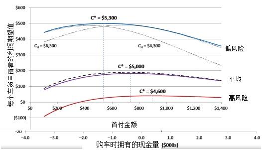 下面的案例来自于美国斯坦福大学LiranEinav等对一个专门为低收入高风险客户提供汽车贷款的公司的研究。由于这家公司的客户违约性高而回收残值低,因此商业利润的高低完全取决于对客户风险的认知。研究中使用的数据显示,这家客户的平均家庭年收入为2万8千元,仅列于当年全国水平的倒数33%位,其中三分之一的贷款申请者无银行账户,86%是租房户。而且超过一半的申请者在贷款前6个月至少逾期了25%的债务。如果没有对数据的挖掘,根据这些条件来看,这些客户的违约风险极高,得到信用贷款的可能性极小。传统的针对风险的信用贷方法是增加首付。但是,研究发现对于每1百元的首付费用的增加,申请贷款的可能性就降低2-3%。而且我们前面所说的逆向选择问题将使得车贷申请者的资质更次。